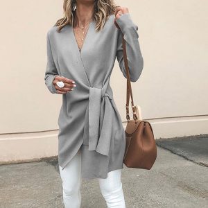 Women's Cardigan Spring Autumn Casual Long Sleeve Jackets With Belt Lace Up Outwear Office V Neck Jacket For Female Clothing